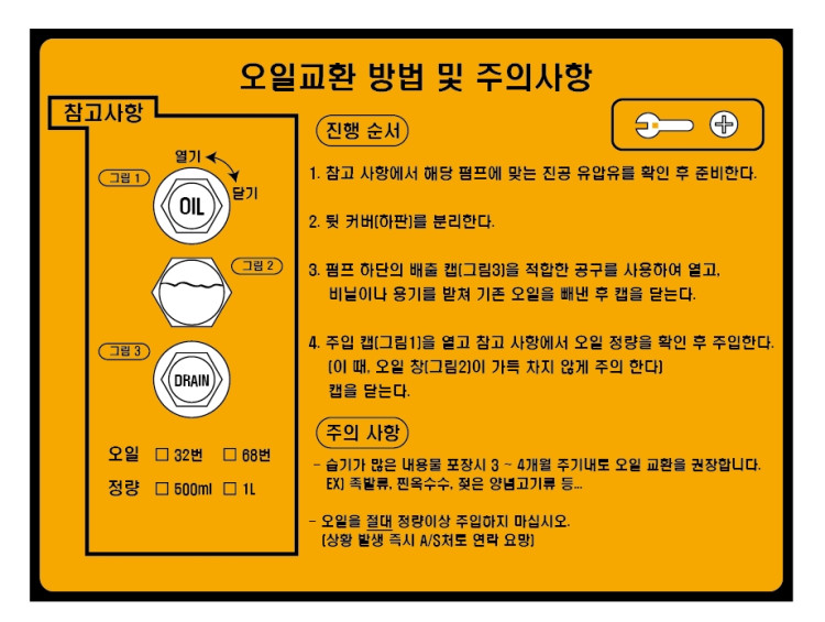 기본적으로 오일 교환하는 방법은 포장기계 후면 스티커에 설명되어 있으나 이곳에도 교환 설명서를 첨부하여두었으니 다운로드하여 숙지하시기 바랍니다.
